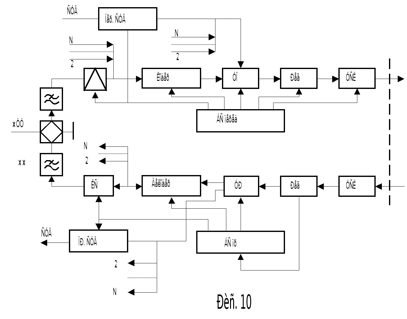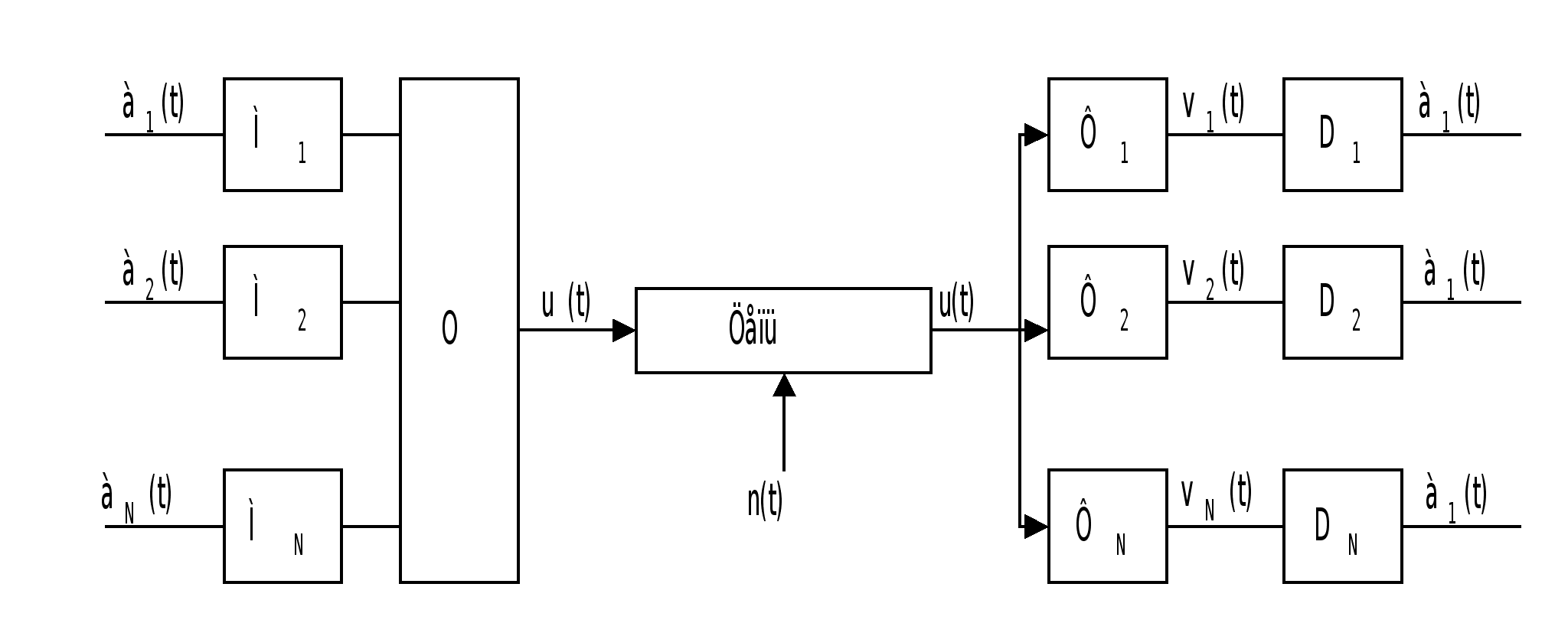 Рис. 1. М – модуляторы, О – устройства объединения, Цепь – цепь связи, Ф – фильтры, D – демодуляторы.