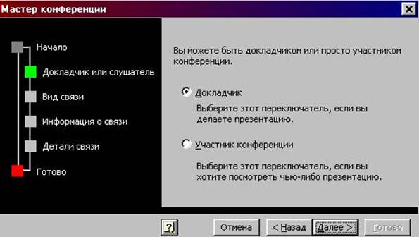 В третьем диалоговом окне указано какой тип связи вы используете, так как мы рассматриваем конференцию в локальной сети, то можно сразу нажимать Далее, если вы хотите использовать интернет , то сначала надо соединиться по модему с вашим поставщиком услуг Интернет.