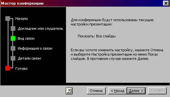 Второе диалоговое окно служит для выбора слайдов которые будут показаны в конференции, по умолчанию будут показаны все файлы, если надо изменить параметры, надо нажать Отмена и выбрать Настройка из меню Показ слайдов. Нажмите кнопку Далее для вывода третьего диалогового окна.