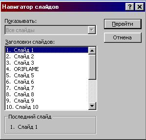 В поле Последний слайд, расположенном в нижней части диалогового окна Навигатор слайдов, отображается заголовок и номер слайда который в настоящий момент демонстрируется аудитории. Если вы хотите пропустить какие-то слайды, нужно прокрутить список слайдов в диалоговом окне Слайды и найти нужный. Выделив слайд, вы можете предварительно просмотреть его в поле, расположенном в правой части диалогового окна. Отслеживание времени с помощью Хронометра.