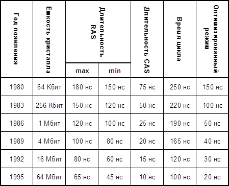Массив данных представляет собой некое подобие координатной сетки, где есть положения по горизонтали (адрес строки) и по вертикали (адрес столбца). На пересечении каждого конкретного адреса строки и столбца находится единичный «строительный элемент» памяти – ячейка, которая представляет собой ключ (транзистор) и запоминающий элемент (конденсатор). Например, для чтения или записи одной ячейки памяти необходимо пять тактов. Сначала на шину выставляется адрес строки. Затем подается сигнал RAS#, который является своего рода контрольным сигналом, передающим полученный адрес для записи в специально отведенное место – регистр микросхемы памяти. После этого передается сигнал столбца, следующим тактом за которым идет сигнал подтверждения принимаемого адреса, но уже для столбца – CAS#. И, наконец следует операция чтения-записи в/из ячейки, контролируемая сигналом разрешения – WE#. Однако, если считываются соседние ячейки, то тогда нет необходимости передавать каждый раз адрес строки или столбца – процессор «надеется», что считываемые данные расположены по соседству. Поэтому, на считывание каждой последующей ячейки понадобится уже 3 такта системной шины. Отсюда и берут свое начало существование определенных схем функционирования (тайминги) отдельно взятой разновидности памяти: x-yyy-yyyy-..., где "x" – количество тактов шины, необходимое для чтение первого бита, а у – для всех последующих. Так, цикл доступа процессора к памяти состоит из двух фаз: запроса (Request) и ответа (Response). Фаза запроса состоит из трех действий: подача адреса, подача запроса (чтения-записи) и подтверждение (необязательно). В фазу ответа входит выдача запрашиваемых данных и подтверждение приема. Довольно часто происходит чтение четырех смежных ячеек, поэтому многие типы памяти специально оптимизированы для данного режима работы, и в сравнительных характеристиках быстродействия обычно приводится только количество циклов, необходимое для чтения первых четырех ячеек. Здесь речь идет о пакетной передаче, которая подразумевает подачу одного начального адреса и дальнейшую выборку по ячейкам в установленном порядке. Такого рода передача улучшает скорость доступа к участкам памяти с заранее определенными последовательными адресами. Обычно процессор вырабатывает адресные пакеты на четыре передачи данных по шине, поскольку предполагается, что система автоматически возвратит данные из указанной ячейки и трех следующих за ней. Преимущество такой схемы очевидно – на передачу четырех порций данных требуется всего одна фаза запроса. Например, для памяти типа FPM DRAM применяется самая простая схема 5-333-3333-... Для памяти типа EDO DRAM после первого считывания блока данных, увеличивается время доступности данных того ряда, к которому происходит доступ в настоящий момент, при этом уменьшая время получения пакета данных, и память уже может работать по схеме 5-222-2222-... Синхронная память типа SDRAM, в отличие от асинхронной (FPM и EDO), «свободна» от передачи в процессор сигнала подтверждения, и выдает и принимает данные в строго определенные моменты времени (только совместно с сигналом синхронизации системной шины), что исключает несогласованность между отдельными компонентами, упрощает систему управления и дает возможность перейти на более «короткую» схему работы: 5-111-1111-... Поэтому в рассм