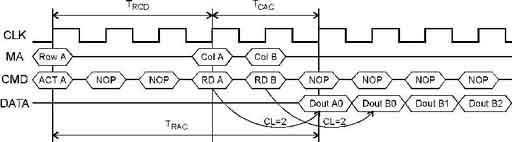 Временная диаграмма чтения SDRAMМикросхемы SDRAM оптимизированы для пакетной передачи. У них при инициализации программируется длина пакета и операционный режим. Пакетный режим может включаться как для всех операций (normal), так и только для чтения (Multiple Burst with Single Write). Этот выбор позволяет оптимизировать память для работы либо с WB, либо с WT-кэшем. Обратим внимание, что внутренний счетчик адреса работает по модулю, равному запрограммированной длине пакетного цикла (например, при длине пакета 4 он не позволяет перейти границу обычного четырехэлементного пакетного цикла). Пакетные циклы могут прерываться (принудительно завершаться) последующими командами, при этом оставшиеся адреса отбрасываются. На рисунке приведен пример прерывания команды чтения по адресу A командой чтения по адресу B (подразумевается, что для адреса B строка уже открыта). В случае прерываний пакетов, как и при полных пакетах, шина данных при активированных банках может быть полезно нагруженной в каждом такте, за исключением случая чтения, следующего за записью. При этом шина будет простаивать CL тактов. В команде WR имеется возможность блокирования записи данных любого элемента пакета — для этого достаточно в его такте установить высокий уровень сигнала маскирования. Микросхемы SDRAM имеют средства энергосбережения. В режиме саморегенерации Self Refresh микросхемы периодически выполняют циклы регенерации по внутреннему таймеру, в этом режиме они не реагируют на внешние сигналы и внешняя синхронизация может быть остановлена. В режиме пониженного потребления Power Down микросхема не воспринимает команды и регенерация не выполняется, поэтому длительность пребывания в нем ограничена периодом регенерации. Синхронный интерфейс позволяет довольно эффективно использовать шину и обеспечить на частоте 100 МГц пиковую производительность 100 Мбит/пин (на 1 вывод шины данных). SDRAM используют в составе модулей DIMM с 8-байтной разрядностью, что дает производительность 800 Мбайт/с. Однако эта теоретическая производительность не учитывает накладные расходы на регенерацию и подразумевает, что требуемые страницы уже открыты. Из-за указанных выше ограничений на реальном произвольном потоке запросов производительность, конечно же, будет ниже. Потенциальные возможности почти одновременного обслуживания множества запросов, предоставляемая микросхемами SDRAM, будут реализованы лишь при достаточно “умном” контроллере памяти. От его предусмотрительности эффективность памяти зависит, пожалуй, больше, чем у простых FPM и EDO DRAM. Память DDR SDRAM (Dual Data Rate — удвоенная скорость данных) представляет собой дальнейшее развитие SDRAM. Как и следует из названия, у микросхем DDR SDRAM данные внутри пакета передаются с удвоенной скоростью — они переключаются по обоим фронтам синхроимпульсов. На частоте 100 МГц DDR SDRAM имеет пиковую производительность 200 Мбит/пин, что в составе 8-байтных модулей DIMM дает производительность 1600 Мбайт/с. На высоких тактовых частотах (100 МГц) двойная синхронизация предъявляет очень высокие требования к точности выдерживания временных диаграмм. Для повышения точности синхронизации предпринят ряд мер. Сигнал синхронизации микросхемы подается в дифференциальной форме, что позволяет снизить влияние смещения уровней на точность синхронизации. Для синхронизации данных в интерфейс введен н