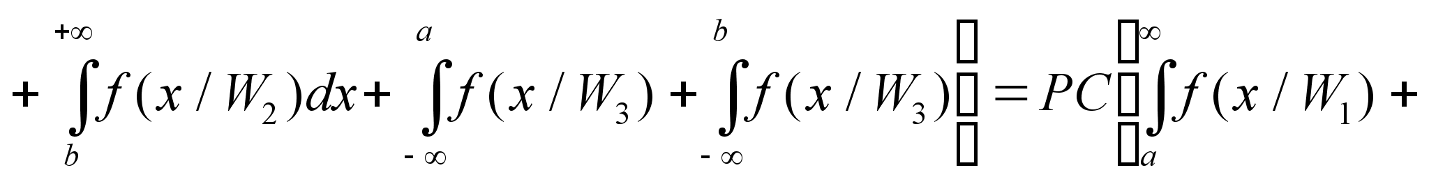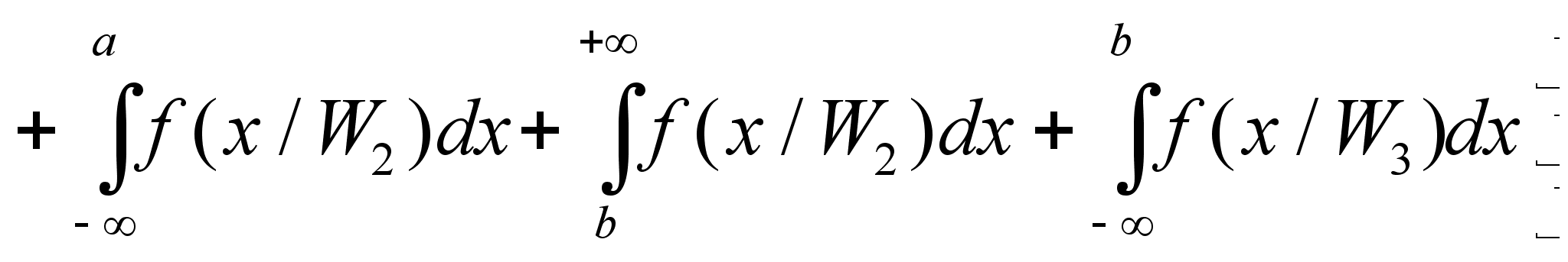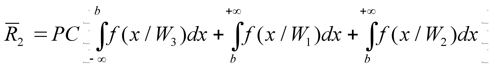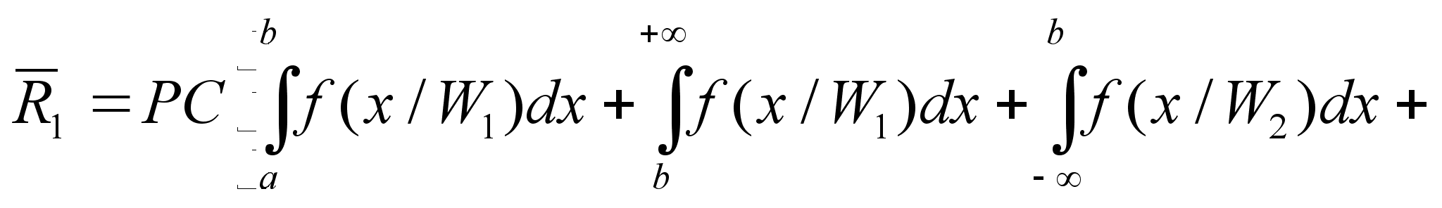 Обозначим указанные области Gi на рисунке. Здесь эти области в силу одномерности случая должны представлять собой отрезки. Поэтому достаточно указать границы а - граница между 1-ым и 2-ым классами; b - граница между 2-ым и 3-им классами Соответственно отрезки: 1-го класса ]- Ґ +a]; 2-го класса ]+a +b]; 3-го класса ]+b + Ґ[ . Теперь можно записать в соответствии с приведенной формулой условные риски ошибочных решений