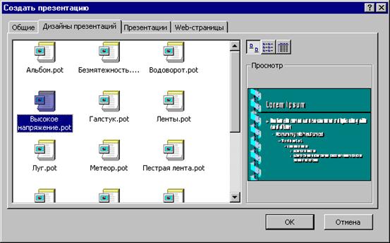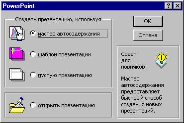 После щелчка на кнопке PowerPoint панели инструментов Microsoft Office появляются главное окно программы и диалоговое окно PowerPoint, в котором программа предлагает образовать пустую презентацию или создать презентацию с помощью мастера автосодержания либо шаблона презентации. При этом предоставляется также возможность открыть файл существующей презентации. Перед началом создания презентации следует хорошо продумать, какую информацию поместить на слайды. При этом надлежит учитывать, что презентация должна длиться не более 45 — 60 минут и состоять из 15— 20 слайдов. Если вы новичок в деле подготовки презентаций и не решили, что вам нужно, воспользуйтесь помощью мастера автосодержания, выбрав соответствующий переключатель и нажав кнопку ОК в окне, изображенном на предыдущем рисунке.