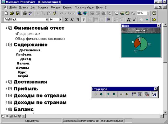 Рекомендуется начинать создание презентации в режиме структуры . В этом режиме удобно разрабатывать план презентации, поскольку на экране видны все заголовки и полный текст, а также проверять структуру презентации и редактировать текст, так как работа ведется в одном окне. Например, для переупорядочивания слайдов или маркированных пунктов достаточно выделить перемещаемое и перенести мышью. В режиме структуры на экране появляется панель инструментов , помогающая быстро организовать содержимое презентации в нужном виде ,её можно расположить в любом месте экрана, чтобы она не мешала работе. Кнопки этой панели позволяют изменять отступы элементов маркированного списка, перемещать элементы списка или весь слайд с одного уровня структуры на другой, отображать и скрывать форматирование, а также сворачивать и разворачивать текст выбранных слайдов. • Для перемещения слайда вместе с содержимым следует перетащить в нужное место документа значок слайда (он расположен слева от заголовка). Для перемещения слайдов предназначены также кнопки Вниз и Вверх панели инструментов Структура. • Вследствие нажатия клавиши [Enter] образуется либо новый абзац, либо новый слайд, что зависит от текущей позиции курсора. • Чтобы создать новый слайд, надлежит сначала ввести текст заголовка, а затем нажимать кнопку Повысить уровень панели инструментов Структура или стандартной панели инструментов до тех пор, пока маркер списка не превратится в значок слайда. • Для перемещения элемента списка в другую позицию необходимо установить курсор слева от него (курсор приобретет вид крестика) и перетащить данный элемент в нужное место. При работе со слайдами в режиме структуры на экране видна миниатюрная копия слайда, что позволяет точно определять момент перехода к следующему слайду при вводе текста. Если в режиме структуры миниатюра слайда не видна на экране, следует вызвать команду Миниатюра меню Вид. Создание новой презентации в режиме структуры 1 Выберите в меню Файл команду Создать, затем выберите тип создаваемой презентации. 2 Выберите в меню Вид команду Структура. 3 Введите заголовок для первого слайда и нажмите клавишу ENTER. 4 На панели инструментов Структуризация нажмите кнопку