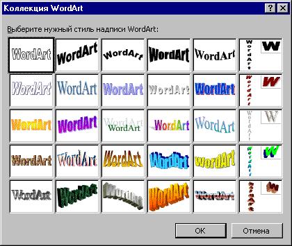 Для создания специального эффекта необходимо щелкнуть на кнопке Добавить объект WordArt панели инструментов Рисование. Кнопка Добавить объект WordArt заменила отдельную программу Microsoft WordArt, которая поставлялась с предыдущими версиями программ Microsoft Office, Microsoft Works, Publisher 95 и т.д. На экране появится окно Коллекция WordArt программы Microsoft WordArt для выбора стиля текста. Выбрав стиль, нажмите кнопку ОК и откройте окно для ввода самого текста. Введите текст, и после щелчка на кнопке ОК он появится в области слайда.