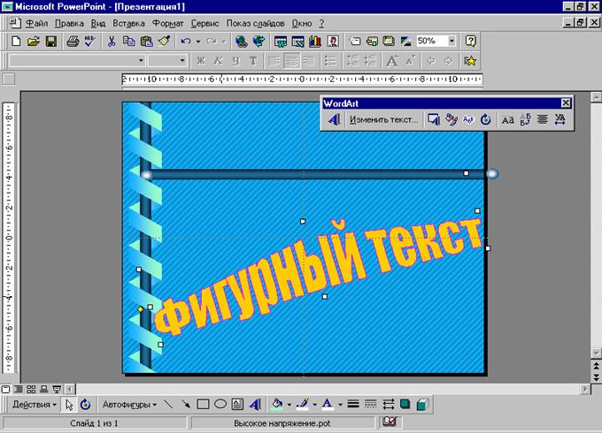 Чтобы закрыть окно для ввода текста, следует выполнить щелчок на кнопке с крестиком в строке заголовка окна, а для выхода из режима создания фигурного текста надлежит щелкнуть в области слайда. Результат вставки фигурного текста представлен на