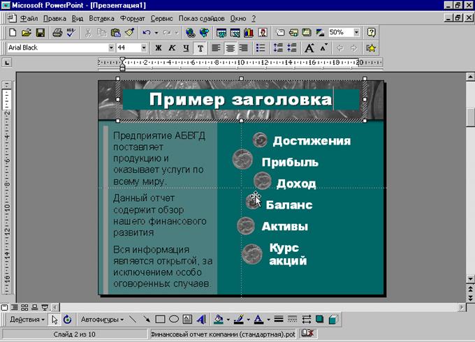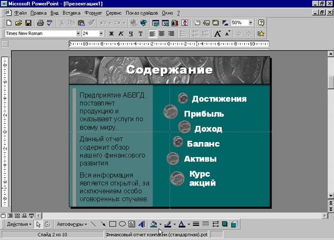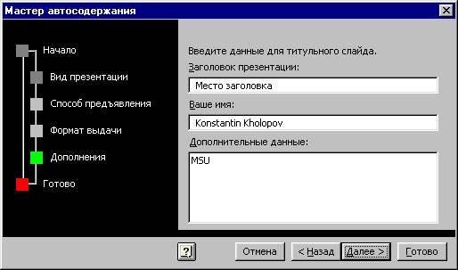 Перейдите к следующему диалоговому окну мастера и выберите вид презентации. Разработчики PowerPoint 97 усовершенствовали мастер автосодержания: увеличилось количество шаблонов, предлагаемых мастером, появились новые шаблоны разнообразного характера, например шаблоны с готовой анимацией. Расширился круг тем презентаций, которые могут быть созданы посредством встроенных шаблонов: мастер предоставляет возможность создавать презентации для совещаний рабочих групп, финансовые отчеты, рекламные буклеты и даже Web- страницы . Мастер также предлагает полезные советы по форматированию презентации и организации слайдов. PowerPoint предоставляет в распоряжение, пользователей и шаблоны компании Dale Carnegie Training с рекомендациями по повышению качества презентаций. Наверное, среди предлагаемых в окне шаблонов вы сможете подобрать нужный. Если же все-таки подходящей темы не нашлось, нажмите кнопку Добавить или Все, чтобы получить список всех шаблонов презентаций. После выбора шаблона презентации (например, Финансовый отчет компании) и нажатия кнопки Далее вы попадете в окно мастера автосодержания, в котором необходимо выбрать способ демонстрации презентации. Если вы планируете проводить презентацию самостоятельно, оставьте включенной опцию Доклады, совещания, выдачи. Если материалы будут опубликованы и затем продемонстрированы без вашего участия, выберите опцию Интернет, киоск. Киоском в PowerPoint 97 называют место, где презентация демонстрируется без участия пользователя (например, рекламный стенд или витрина магазина). В следующем диалоговом окне мастера автосодержания необходимо определить форму выдачи материалов (слайды, черно-белые или цветные прозрачки, презентация на экране компьютера) и указать, нужен ли раздаточный материал при проведении презентации. Кроме того, надлежит ввести данные о себе: название фирмы, какой-либо девиз и т.п. Эта информация будет размещена на титульном слайде презентации.