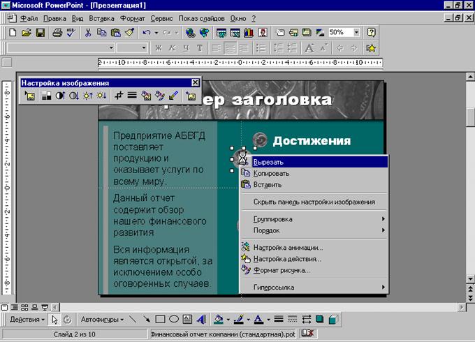 Наличие в меню команд Гиперссылка и Отобразить (Скрыть) панель настройки изображения свидетельствует, что выделен рисунок, оформленный как гиперссылка. Эти команды позволяют заменить или отредактировать рисунок и изменить объект гиперссылки.