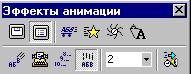 1 – Анимация заголовка (Заголовок выдвигается из-за верхнего края слайда) 2- Анимация текста слайда (Текст слайда появляется по строкам) 3- Эффект въезда (Текст выдвигается из-за пр авого края слайда) 4- Эффект полета (Текст выдвигается из-за левого края слайда) 5-Эффект камеры (Эффект просмотра текста через диафрагму фотообъектива) 6-Вспышка (Эффект мгновенного появления текста на слайде и его последущего исчезновения) 7-Лазерный эффект (Текст появляется по буквам из верхнего правого угла слайда) 8-Пишущая машинка (Эффект появления текста по буквам) 9-Обратный порядок построения (Текст появляется , начиная с последних строк или слов) 10-Вбрасывание (Слова текста по очереди выдвигаются из-за верхнего края слайда) 11-Порядок эффектов (Данная кнопка предназначена для создания сложных анимационных эффектов на слайдах , которые содержат несколько объектов) 12-Кнопка настройки анимации Панель инструментов Эффекты анимации открывается в результате выполнения щелчка на одноименной кнопке панели инструментов Форматирование или вследствие активизации одноименной команды в контекстном меню панелей инструментов. Инструменты панели Эффекты анимации описаны в следующей таблице. Панель инструментов Эффекты анимации и команда Встроенная анимация меню Показ слайдов позволяют задать для текста и других объектов слайда один из одиннадцати встроенных анимационных эффектов PowerPoint. Воспользовавшись кнопкой Эффекты анимации и диалоговым окном Настройка анимации, пользователь сможет создать новые анима-ционные эффекты и применить их на практике. Некоторые анимационные эффекты могут иметь звуковое сопровождение. Примечание: Диалоговое окно Настройка анимации открывается также командой Настройка анимации меню Показ слайдов.