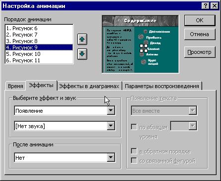 Если анимационные эффекты для объектов не заданы, в окне Настройка анимации названия всех объектов текущего слайда находятся в списке Объекты без анимации (вкладка Время). Установка переключателя включить в группе Анимация переводит выделенный объект из этого списка в список Порядок анимации, в котором все объекты анимации проектируемого слайда перечисляются в той последовательности, в которой они будут воспроизводиться в ходе презентации. Номера объекта в данном списке и в списке Порядок эффектов панели инструментов Эффекты анимации совпадают. Кнопки со стрелками рядом со списком Порядок анимации позволяют изменять последовательность элементов этого списка, вследствие чего становится другим и порядок воспроизведения анимационных эффектов при демонстрации слайда. Все пользовательские анимационные эффекты создаются путем комбинирования значений в областях Выберите эффект и звук и Появление текста вкладки Эффекты. Установки на вкладке Эффекты доступны, если выделенный на слайде объект не является диаграммой (анимационные эффекты для диаграмм разрабатываются на вкладке Эффекты в диаграммах). • После составления списка объектов анимации на вкладке Время перейдите на вкладку Эффекты. • В группе Выберите эффект и звук выберите нужные анимационные эффекты, а в группе Появление текста — способ появления текста в текущем объекте слайда. Все объекты слайда отображаются в поле предварительного просмотра в правой верхней части окна. Кнопка Просмотр позволяет увидеть в этом поле, как будет выглядеть презентация с заданными в окне параметрами. Чтобы отменить анимационный эффект для выбранного объекта, перейдите на вкладку Время и установите опцию выключить. Отображение установок табуляции и втяжки 1 В режиме слайдов выделите текст, для которого следует отобразить параметры табуляции и втяжки. 2 Если линейка не показана, выберите в меню Вид команду Линейка. На линейке обозначаются позиции табуляции и втяжки для текста, находящегося внутри данного текстового объекта.