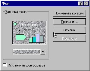 3 Повторите предыдущий пункт для каждого уровня маркировки, подлежащего изменению. По умолчанию PowerPoint выбирает символ маркера из шрифта Symbol. Если данный шрифт недоступен, PowerPoint использует шрифт WingDings, в котором соответствующий символ ANSI имеет вид циферблата часов. Сам маркер не подлежит выделению. Чтобы изменить или удалить маркер, щелкните связанный с ним текст. Изменение шаблона Чтобы фон слайда принял другой вид, можно изменить его цвет, оттенение, узор или текстуру. Кроме того, в качестве фона можно использовать какой-либо рисунок. При этом следует учитывать, что на слайде или в образце допускается только один вид фона. Например, фон выполняется в виде оттенения, текстуры или рисунка, но на любом отдельно взятом слайде используется только один из этих вариантов. Изменение, вносимое в фон, применяется только к текущему слайду или ко всем слайдам и образцу. 1 В режиме слайдов выберите в меню Формат команду Фон. 2 В группе Заливка фона щелкните стрелку вниз. 3 Для изменения цвета, входящего в цветовую схему, щелкните один из восьми цветов в группе Авто. Чтобы изменить цвет, не входящий в цветовую схему, нажмите кнопку Дополнительные цвета. Щелкните нужный цвет на вкладке Обычные или перейдите на вкладку Спектр, создайте свой цвет и нажмите кнопку OK. Для восстановления цвета фона, используемого по умолчанию, нажмите кнопку Авто. 4 Чтобы применить внесенное изменение к текущему слайду, нажмите кнопку Применить. Чтобы применить изменение ко всем слайдам и образцу слайдов, нажмите кнопку Применить ко всем.