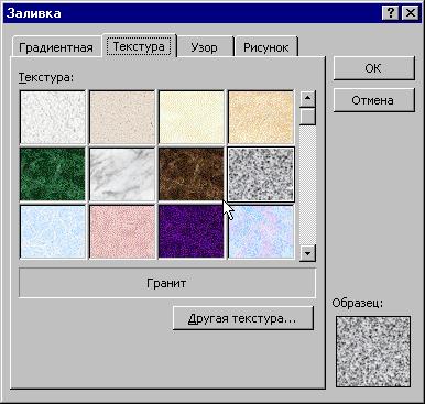 Добавление или изменение градиентного фона 1 В режиме слайдов выберите в меню Формат команду Фон. 2 В группе Заливка фона щелкните стрелку вниз, затем щелкните Способы заливки и перейдите на вкладку Градиентная. 3 Выберите нужные параметры и нажмите кнопку OK. 4 Чтобы применить внесенное изменение к текущему слайду, нажмите кнопку Применить. Чтобы применить изменение ко всем слайдам и образцу слайдов, нажмите кнопку Применить ко всем. Добавление или изменение фона с узором 1 В режиме слайдов выберите в меню Формат команду Фон. 2 В группе Заливка фона щелкните стрелку вниз, затем щелкните Способы заливки и перейдите на вкладку Узор. 3 Выберите нужные параметры и нажмите кнопку OK. 4 Чтобы применить внесенное изменение к текущему слайду, нажмите кнопку Применить. Чтобы применить изменение ко всем слайдам и образцу слайдов, нажмите кнопку Применить ко всем. Добавление или изменение фона с текстурой 1 В режиме слайдов выберите в меню Формат команду Фон. 2 В группе Заливка фона щелкните стрелку вниз, затем щелкните Способы заливки и перейдите на вкладку Текстура.