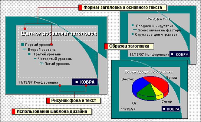 В последнем окне мастера автосодержания PowerPoint сообщает, что предварительная работа по созданию презентации завершена, и предлагает нажать кнопку Готово. Через некоторое время на экране появится титульный слайд презентации. Чтобы не потерять результаты своей работы, сохраните презентацию с помощью команды Сохранить как меню Файл. В PowerPoint 97 в процессе сохранения файлов можно использовать ряд новых графических форматов, например jpeg, wmf, eps, pict и gif. При выборе формата следует принимать во внимание, что презентацию PowerPoint 97 можно использовать в предыдущих версиях программы, например в PowerPoint 95 или в PowerPoint 4.0. Для этого надлежит сохранить презентацию PowerPoint 97 в формате файла PowerPoint 95 или PowerPoint 4.0, выбрав нужный формат в списке Тип файлов диалогового окна Сохранить как. Кроме того, существует возможность сохранения презентации в двойном формате — PowerPoint 95 и PowerPoint 97. В этом случае открывать можно презентации, разработанные в PowerPoint обеих версий, а редактировать и сохранять — только презентации, созданные в PowerPoint 97. Если презентация сохранена в двойном формате, увеличивается размер файла и требуется больше времени для его сохранения. Сохранение презентации в формате PowerPoint 95 может привести к такому преобразованию данных или изменению форматирования, что восстановить первоначальный вид презентации в PowerPoint 97 не удастся. Например, при сохранении презентации в формате PowerPoint 95 недоступны анимационные эффекты на диаграммах и объемные эффекты, созданные в PowerPoint 97, теряются гиперссылки, искажаются автофигуры, кривые и соединительные линии. Кроме того, могут нарушаться контрастность и яркость внедренных и связанных объектов. При первом сохранении следует вводить дополнительные сведения о презентации (свойства), что позволит быстро обнаруживать ее среди множества похожих файлов. Свойства (название, автор, тема, ключевые слова, дата последнего изменения) можно указать для любого файла Microsoft Office 97. Чтобы не забывать вводить свойства, установите флажок запрашивать свойства файла на вкладке Сохранить диалогового окна Параметры. Использование шаблонов. Разработка пользовательских презентации Хотя мастер автосодержания — прекрасный помощник при создании презентации, в некоторых случаях его возможностей недостаточно. В этой главе мы ознакомимся со средствами PowerPoint, позволяющими подготовить презентацию без помощи мастера. Начать необходимо с разработки плана презентации и структуры слайдов. В состав PowerPoint включены шаблоны двух видов: шаблоны дизайна и шаблоны содержания. Шаблоны дизайна содержат заранее определенные форматы и цветовые схемы, которые можно применять к любой презентации для придания ей нестандартного вида. Шаблоны содержания, кроме тех же форматов и цветовых схем, предлагают определенное содержимое по конкретным темам. Любой из этих шаблонов можно изменить по своему вкусу. Можно создать новый шаблон на основе уже созданной презентации. В такой шаблон войдет все ее содержимое (текст, графика и слайды), и все лишнее можно удалить. 1 В меню Файл выберите команду Создать, затем перейдите на вкладку Презентации. 2 Откройте презентацию на нужную тему. 3 Внесите в шаблон необходимые изменения. Например, замените предложенное содержание, измените цветовую схему, примените другой шаблон оформления, измените элементы фона в образце 