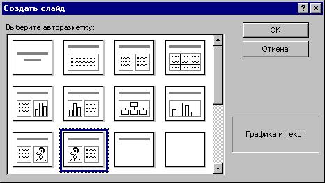 кнопку Показ слайдов Создание нового слайдаВыбор авторазметки для создаваемого слайда осуществляется в области Выберите авторазметку. Краткое описание авторазметки отображается в правом нижнем углу окна. Если выполнить двойной щелчок на образце авторазметки, появится новый слайд в режиме просмотра.