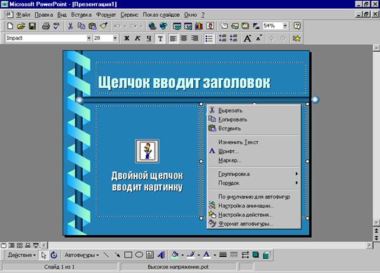 В полях всех слайдов, кроме пустого, находятся местозаполнители (placeholders), указывающие, куда вводить информацию: заголовок, список, диаграмму, таблицу, графический объект или клип. Места вставки обозначены на слайде тонкой пунктирной линией и содержат стандартные приглашения вводить объекты. Каждый местозаполнитель представляет собой текстовое поле (надпись). Приемы работы с текстовыми полями в PowerPoint те же, что и с надписями или графическими объектами (автофигурами) в других приложениях пакета Microsoft Office 97. Например, вы можете изменять цвет, тип обрамления, фон, размеры и положение на слайде текстовых полей PowerPoint. По умолчанию текстовые поля имеют вид прямоугольника без фона и обрамления. Пользователю предоставлена возможность накладывать одно текстовое поле на другое. Команда Порядок, находящаяся в контекстном меню поля, изменяет порядок следования перекрывающихся текстовых полей. Таким образом изменяют стандартную разметку слайдов. Программа PowerPoint позволяет задавать для текстового поля специальные эффекты. Для этого предназначена команда Настройка анимации. Текстовому полю можно придать форму любой автофигуры (эллипса, куба, кольца, выноски, ленты и т.д.). Чтобы изменить форму поля, выполните следующие действия: