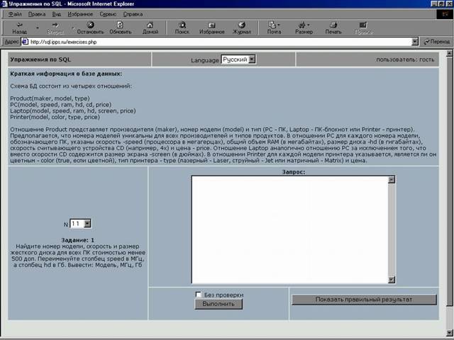 Рис. 1. Интерфейс системы дистанционного обучения языку SQL (http://sql.ipps.ru/exercises.php). Схема взаимодействия пользователя с системой сводится к следующему. Для каждого упражнения приводится описание базы данных и на естественном языке (русском или английском, по выбору пользователя) формулируется задание на выборку. Пользователь должен написать оператор SELECT, реализующий выборку требуемых данных. Проверка запроса пользователя осуществляется, если нажать кнопку "Выполнить" (рис.1). Если запрос синтаксически правилен, но сформулирован неверно логически, будут возвращены данные запроса пользователя и данные правильного запроса. Одни только правильные данные можно получить, если нажать кнопку "Показать правильный результат". Кроме того, если установить флажок "Без проверки", можно писать любые запросы на получение данных из учебной базы данных; при этом проверка запроса пользователя не выполняется. Задания имеют разный уровень сложности, что, по мнению авторов, делает сайт полезным не только новичкам, но и опытным разработчикам приложений баз данных и администраторам СУБД. На сегодняшний день на сайте представлено порядка 70 упражнений, большая часть которых заимствована из книги известного специалиста в области баз данных Дж. Ульмана [Джеффри Д.Ульман, Дженнифер Уидом., 2000]. В качестве примера рассмотрим одно из простых заданий (стоимость вопроса 1 балл) для базы данных "Компьютерная фирма", схема которой показана на рис. 2.