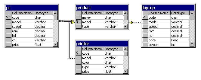 Рис. 2. Схема данных учебной БД "Компьютерная фирма". Задание звучит так: "Найдите всех производителей принтеров; вывести: Maker". Правильным решением может быть такой запрос: SELECT DISTINCT Maker FROM Products WHERE type='printer' Пусть результатом выполнения данного запроса является следующая одностолбцовая таблица: