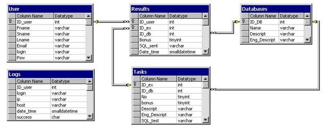 Рис.4 Схема данных БД Main. В таблице Databases содержится описание учебной базы данных, а в таблице Tasks - информация об упражнениях: текст задания, скрипт эталонного ответа на него и стоимость (сложность) вопроса. Наибольший интерес представляет способ проверки правильности решения упражнения. Поскольку пользователь может решить упражнение разными способами, то была реализована идея сравнения не самих запросов, а результирующих наборов данных [Моисеенко С.И., Майстренко А.В., 2002]. В результате чего существенную роль приобретает используемая СУБД. Теперь она используется не только для хранения служебной информации, но и фактически выполняет запросы пользователя. Алгоритм сравнения набора данных, возвращаемого запросом пользователя, с набором данных эталонного запроса базируется на одинаковом упорядочении столбцов и одинаковой сортировке строк в этих двух наборах данных. Результирующие наборы совпадают, еслисодержат, во-первых, одинаковое число столбцов и строк и, во-вторых, одинаковые значения в каждой соответствующей ячейке таблиц, т.е. задача сводится к сравнению на равенство двух двумерных массивов при очевидном преобразовании типов. Как упоминалось выше, попытки "обмануть систему" простым перечислением данных из правильного результата блокируется сравнением запроса пользователя на независимых данных, недоступных для просмотра. Разумеется, все же остается вероятность того, что логически неправильный запрос вернет "правильные данные", однако, тестирование системы показало, что эта вероятность весьма мала и зависит от того, насколько тщательно подобраны данные в контрольной базе данных Alt_Exercises. Кстати говоря, эту вероятность можно еще уменьшить, используя несколько контрольных баз данных. Так или иначе, окончательный ответ сможет дать только эксплуатация системы, к чему мы и призываем всех интересующихся как дистанционным обучением, так и базами данных. Следует сказать несколько слов об используемом диалекте SQL. Поскольку запрос пользователя выполняется применяемой в системе СУБД, исключительную важность приобретает то, насколько диалект SQL этой СУБД соответствует стандарту языка SQL. Дело в том, что мы ставили себе задачу обучения SQL как универсальному средству взаимодействия с базами данных, а не работе с конкретной СУБД. По этой причине мы отказались от использования свободно распространяемых СУБД типа MySQL, которая на момент реализации обучающей системы не поддерживала, например, подзапросов в операторе SELECT. Сейчас мы применяем MS SQL Server 2000, диалект языка SQL, которого весьма близок к стандарту SQL-92. Именно следование этому стандарту было выдержано при написании справки по использованию оператора SELECT, которой можно воспользоваться при решении упражнений на сайте. Хотелось бы отметить высокую степень мотивации, обусловленную использованием рейтинговой системы представления показанных пользователями результатов (см. таблицу 1). Зарегистрированный в системе "Упражнения по SQL" пользователь автоматически участвует в рейтинге. В зависимости от сложности задания, посетитель получает от 1 до 3 баллов за правильное решение. На первом этапе тестирования посетителям сайта доступны 62 упражнения, которые можно решать в любом порядке. Здесь есть как простые упражнения, так и сложные. Более высокое место занимает тот, кто набр