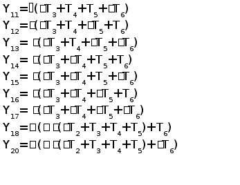 Y1=щ (щ щ(T2+T3+T4+T5)+щT6) Y2= щ(T3+T4+щT5+T6) Y3= щ(T3+T4+щT5+щT6) Y5= щ(T3+щT4+T5+T6) Y7= щ(T3+щT4+T5+щT6) Y8= щ(T3+щT4+щT5+T6) Y9= щ(T3+щT4+щT5+щT6) Y10=щ(щT3+T4+T5+T6) Сигнали мікрооперацій yj отримаємо, об'єднуючи по “або" виходи відповідні операторам Yi, в яких зустрічається МО yj. При цьому будемо користуватися таблицею Таблиця 2.5.