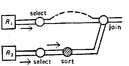 и наоборот. 3. Повышение производительности МВД обычно связывается со скоростью выполнения операций, деревьев запросов, отдельных транзакций и смеси таких транзакций. При этом выдача данных терминальному пользователю начинает осуществляться только после выполнения последней реляционной операции в последовательности операций, соответствующих запросу. Иногда для принятия решения достаточно нескольких кортежей, являющихся результатом этой последовательности (дерева запроса). Увеличение реактивности МБД при выдаче этих нескольких кортежей, удовлетворяющих запросу, часто противоречит увеличению традиционной пропускной способности МВД. Решить эту проблему можно только реализацией в МВД такого режима потоковой обработки отношений, при котором реляционная операция начнет выдавать результирующие кортежи, не ожидая появления целиком сформированных отношений-операндов. Для ряда операций реляционной алгебры сложности 0(n^2) (где n-кардинальность отношений-операндов) реализация такого режима трудно разрешима, например для операции сортировки отношений.
