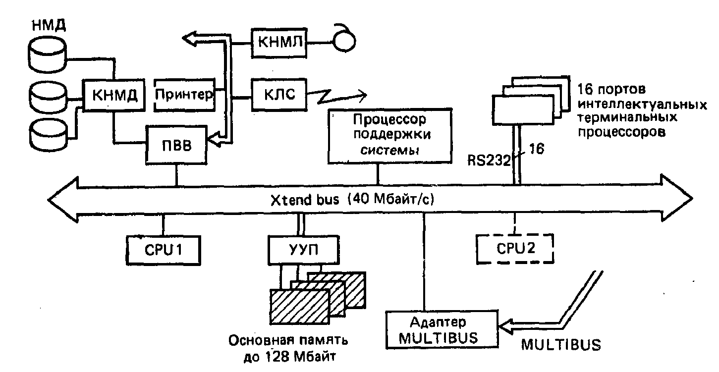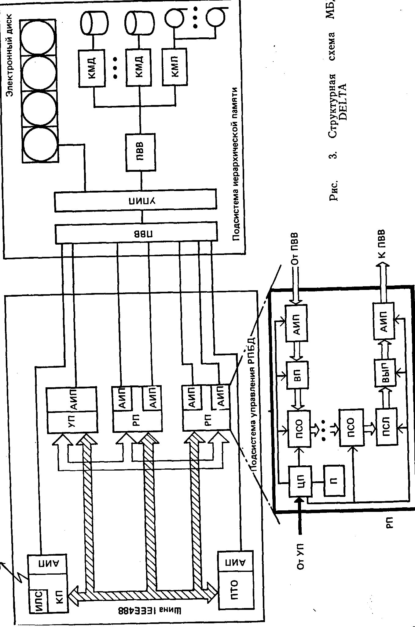 подсистемы иерархической памяти (ИЛ), содержащей системную буферную память (электронный кэш-диск емкостью 128 Мбайт), массовую память с восемью НМД (с контроллером магнитного диска КМД) общей емкостью 20 Гбайт и четырьмя НМЛ (с контроллером магнитной ленты - КМЛ) , а также универсальную микроэвм в качестве управляющего процессора иерархической памяти (УПИП) и процессора ввода-вывода (ПЕВ). Связь между подсистемами осуществляется высокоскоростным каналом со стандартным интерфейсом со скоростью передачи до 3 Мбайт/с. Все процессоры подсистемы вторичной обработки подключаются к этому каналу посредством ПВВ через специальные адаптеры иерархической памяти (АИП).