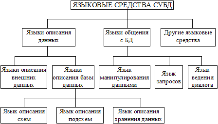 Рис.2.2. Схема классификации языковых средств БнД Схема имеет общий характер и ориентирована на различные СУБД. Однако не каждая СУБД, которая сейчас используется на практике и распространена на рынке программных продуктов, имеет весь набор указанных языковых средств. Язык описания данных (DDL - Data Definition Language), предназначен для описания данных на разных уровнях абстракции: внешнем, логическом и внутреннем. Исходя из предложений CODASYL, языки описания данных на логическом (концептуальном) и внутреннем уровнях независимые и разные. Однако в большинстве промышленных СУБД языки не делится на два отдельных языка описания логической и физической организации данных, а существует единый язык, которая еще называется языком описания схем. В известных и широко используемых на практике СУБД семьи dBASE применяется единый язык описания данных. Он предназначен для представления данных на логическом и физическом уровнях. Этот язык имеет свой синтаксис: например, имя файла не должно превышать восьми символов, а имя поля - десяти; при этом каждое имя может начинаться с буквы, поля календарной даты обозначаются символом D (DATA), символьные поля — С (CHARACTER), числовые — N (NUMERIC), логические — L (LOGICAL), примечаний — М (MEMO). Описание всех имен, типов и размеров полей сохраняется в памяти вместе с данными; эти структуры в случае необходимости можно просмотреть и исправить. Если логический и физический уровни отделены, то в состав СУБД может входить язык описания сохранения данных. В некоторых СУБД используется еще язык описания подсхем, который нужен для описания части БД, которая отражает информационные потребности отдельного пользователя или прикладной программы. В составе СУБД типа dBASE такой язык не используется. Язык описания данных на внешнем уровне используется для описания требований пользователей и прикладных программ и создания инфологической модели БД. Этот язык не имеет ничего общего с языками программирования. Так, языковым средством, которое используются для инфологического моделирования, является обычный естественный язык или его подмножество, а также язык графов и матриц. Язык манипулирования данными (DML - Data Manipulation Language) используется для обработки данных, их преобразований и написания программ. DML может быть базовым или автономным. Базовый язык DML — это один из традиционных языков программирования (BASIC, C, FORTRAN и др.). Системы, которые используют базовый язык, называют открытыми. Использование базовых языков как языков описания данных сужает круг лиц, которые могут непосредственно обращаться к БД, поскольку для этого нужно знать язык программирования. В таких случаях для упрощения общения конечных пользователей с БД предполагается язык ведения диалога, который значительно проще для овладения, чем язык программирования. Автономный язык DML — это собственный язык СУБД, который дает возможность выполнять различные операции с данными. Системы с собственным языком называют закрытыми. В современных СУБД для упрощения процедур поиска данных в БД предусмотрен язык запросов. Наиболее распространенными языками запросов являются SQL и QBE. Язык запросов SQL (Structured Query Language - структурированный язык запросов) был создан фирмой IBM в рамках работы над проектом построения системы управления реляционными базами данных в начале 70-х годов. Американский национ