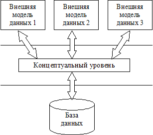 Рис. 2.1. Трехуровневая модель системы управления базой данных, предложенная ANSI 1. Уровень внешних моделей — самый верхний уровень, где каждая модель имеет свое «видение» данных. Этот уровень определяет точку зрения на БД отдельных приложений. Каждое приложение видит и обрабатывает только те данные, которые необходимы именно этому приложению. Например, система распределения работ использует сведения о квалификации сотрудника, но ее не интересуют сведения об окладе, домашнем адресе и телефоне сотрудника, и наоборот, именно эти сведения используются в подсистеме отдела кадров. 2. Концептуальный уровень — центральное управляющее звено, здесь база данных представлена в наиболее общем виде, который объединяет данные, используемые всеми приложениями, работающими с данной базой данных. Фактически концептуальный уровень отражает обобщенную модель предметной области (объектов реального мира), для которой создавалась база данных. Как любая модель, концептуальная модель отражает только существенные, с точки зрения обработки, особенности объектов реального мира. 3. Физический уровень — собственно данные, расположенные в файлах или в страничных структурах, расположенных на внешних носителях информации. Эта архитектура позволяет обеспечить логическую (между уровнями 1 и 2) и физическую (между уровнями 2 и 3) независимость при работе с данными. Логическая независимость предполагает возможность изменения одного приложения без корректировки других приложений, работающих с этой же базой данных. Физическая независимость предполагает возможность переноса хранимой информации с одних носителей на другие при сохранении работоспособности всех приложений, работающих с данной базой данных. Это именно то, чего не хватало при использовании файловых систем. Выделение концептуального уровня позволило разработать аппарат централизованного управления базой данных. Классификация банков данныхБанки данных — это очень сложная система, которую можно классифицировать по целому спектру признаков, касающихся как банка в целом, так и отдельных его компонентов. По назначению БнД бывают: - информационно-поисковые; - специализированные по отдельным областям науки и техники; - банки данных АСУ для организационно-экономической информации; - банки данных для систем автоматизации научных исследований и производственных испытаний; - банки данных для систем автоматизированного проектирования. По архитектуре поддерживаемой вычислительной среды БнД бывают централизованными (интегрированными) и распределенными. По виду информации, которая сохраняется, банки делятся на банки данных, банки документов и банки знаний. По языку общения пользователя с БД различают системы с базовым языком (открытые системы) и с собственным языком (закрытые системы). В открытых системах языковым средством общения с БД один из языков программирования, например C, Pascal. В таких системах для общения с БД нужен посредник, то есть программист, который владеет избранным языком программирования. Закрытые системы имеют собственный язык общения. Он, как правило, намного проще, чем язык программирования. Поэтому в таких системах не нужен посредник-программист для общения с БД. Сами пользователи, которые имеют соответствующую подготовку, смогут работать с БД. Одними из основополагаю
