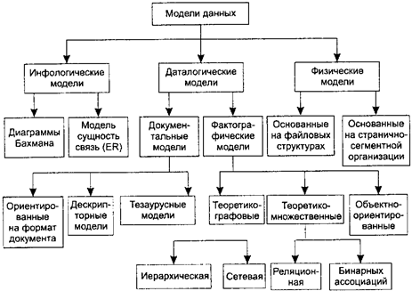Рис. 2.4. Классификация моделей данных На рис. 2.4 представлена классификация моделей данных. В соответствии с рассмотренной ранее трехуровневой архитектурой мы сталкиваемся с понятием модели данных по отношению к каждому уровню. И действительно, физическая модель данных оперирует категориями, касающимися организации внешней памяти и структур хранения, используемых в данной операционной среде. В настоящий момент в качестве физических моделей используются различные методы размещения данных, основанные на файловых структурах: это организация файлов прямого и последовательного доступа, индексных файлов и инвертированных файлов, файлов, использующих различные методы хеширования, взаимосвязанных файлов. Кроме того, современные СУБД широко используют страничную организацию данных. Физические модели данных, основанные на страничной организации, являются наиболее перспективными. Наибольший интерес вызывают модели данных, используемые на концептуальном уровне. По отношению к ним внешние модели называются подсхемами и используют те же абстрактные категории, что и концептуальные модели данных. Кроме трех рассмотренных уровней абстракции при проектировании БД существует еще один уровень, предшествующий им. Модель этого уровня должна выражать информацию о предметной области в виде, независимом от используемой СУБД. Эти модели называются инфологическими, или семантическими, и отражают в естественной и удобной для разработчиков и других пользователей форме информационно-логический уровень абстрагирования, связанный с фиксацией и описанием объектов предметной области, их свойств и их взаимосвязей. Инфологические модели данных используются на ранних стадиях проектирования для описания структур данных в процессе разработки приложения, а даталогические модели уже поддерживаются конкретной СУБД. Документальные модели данных соответствуют представлению о слабоструктурированной информации, ориентированной в основном на свободные форматы документов, текстов на естественном языке. Модели, основанные на языках разметки документов, связаны, прежде всего, со стандартным общим языком разметки — SGML (Standard Generalized Markup Language), который был утвержден ISO в качестве стандарта еще в 80-х годах. Этот язык предназначен для создания других языков разметки, он определяет допустимый набор тегов (ссылок), их атрибуты и внутреннюю структуру документа. Контроль за правильностью использования тегов осуществляется при помощи специального набора правил, называемых DTD-описаниями. которые используются программой клиента при разборе документа. Для каждого класса документов определяется свой набор правил, описывающих грамматику соответствующего языка разметки. С помощью SGML можно описывать структурированные данные, организовывать информацию, содержащуюся в документах, представлять эту информацию в некотором стандартизованном формате. Но ввиду некоторой своей сложности SGML использовался в основном для описания синтаксиса других языков (наиболее известным из которых является HTML), и немногие приложения работали с SGML-документами напрямую. Гораздо более простой и удобный, чем SGML, язык HTML позволяет определять оформление элементов документа и имеет некий ограниченный набор инструкций — тегов, при помощи которых осуществляется процесс размет