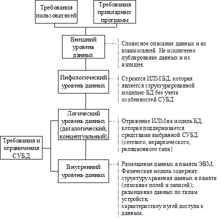 Рис. 4.1. Схема взаимосвязи уровней представление данных в БД Внешний уровень — подготовительный этап инфологического проектированияЦелью проектирования на внешнем уровне является разработка внемашинного информационного обеспечения, которое включает систему входной (первичной) документации, характеризующую определенную предметную область, систему классификации и кодирования технико-экономической информации, а также перечень соответствующих выходных сообщений, которые нужно формировать с помощью БнД. Существуют два подхода к проектированию баз данных на внешнем уровне: «от предметной области» и «от запроса». Подход «от предметной области» состоит в том, что формируется внешнее информационное обеспечение всей предметной области без учета потребностей пользователей и прикладных программ. Иногда этот подход называют еще объектным или непроцессным. При подходе «от запроса» основным источником информации о предметной области есть изучение запросов пользователей и потребностей прикладных программ. Этот подход также называется процессным или функциональным. При таком подходе БД проектируется для выполнения текущих задач управления без учета возможности расширение системы и возникновение новых задач управление. Преимущество подхода «от предметной области» это его объективность, системность при отображении ПО и стойкость информационной модели, возможность реализации большого количества прикладных программ и запросов, в том числе незапланированных при создании БД. Недостатком этого подхода является значительный объем работ, которые необходимо выполнить при определении информации. подлежащей хранению в БД, что, соответственно, усложняет и увеличивает срок разработки проекта. Функциональный подход ориентирован на реализацию текущих требований пользователей и прикладных программ без учета перспектив развития системы. При его использовании могут возникнуть сложности в агрегации требований разных пользователей и прикладных программ. Тем не менее, при таком подходе значительно уменьшается трудоемкость проектирования, и поэтому возможно создать систему с высокими эксплуатационными характеристиками. Однако взятый в отдельности любой из этих методов не может дать достаточно информации для проектирования рациональной структуры БД. Поэтому при проектировании БД целесообразно совместно использовать эти два подхода. Если схематично представить процесс проектирования БД на внешнем уровне, то он состоит из таких работ. 1. Определение функциональных задач предметной области, которые подлежат автоматизированному решению. Поскольку основной целью создания БД есть обеспечение информацией функций обработки данных, то, прежде всего, необходимо изучить все функции предметной области (объекта управления), для которой разрабатывается база данных, и проанализировать их особенности. Функции и функциональные особенности объекта управление необходимо изучать в неразрывной связи с изучением функциональных требований к данным со стороны будущих пользователей информационной системы. Изучение и анализ предусматривают выявление информационных потребностей и определения информационных потоков. Эти работы можно выполнять обследованием предметной области и анкетированием ее сотрудников. Результатом такого