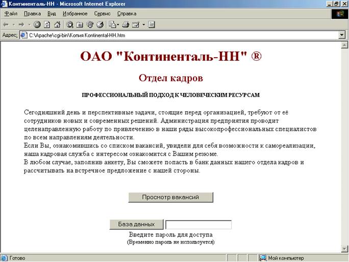 Kontinental-HH.htm <html> <head><title>Континенталь-НН</title></head> <body bgcolor="#faf1d8"> <center><h1><font color="#800000">ОАО "Континенталь-НН" ®</font></h1></center> <p ALIGN="center"><font size="5"><strong><font color="#800000">Отдел кадров</font></strong></font></p> <p ALIGN="center"><font size="2"><strong>ПРОФЕССИОНАЛЬНЫЙ ПОДХОД К ЧЕЛОВЕЧЕСКИМ РЕСУРСАМ</font></strong></p> <table border="0"> <tr><td><blockquote class="text"> Сегодняшний день и перспективные задачи, стоящие перед организацией, требуют от её сотрудников новых и современных решений. Администрация предприятия проводит целенаправленную работу по привлечению в наши ряды высокопрофессиональных специалистов по всем направлениям деятельности.<br> Если Вы, ознакомившись со списком вакансий, увидели для себя возможности к самореализации, наша кадровая служба с интересом ознакомится с Вашим резюме.<br> В любом случае, заполнив анкету, Вы сможете попасть в банк данных нашего отдела кадров и рассчитывать на встречное предложение с нашей стороны. </blockquote> </td></tr> </table> <form action="http://myserver/cgi-bin/list.bat"> <center><input type="submit" value="Просмотр вакансий"></center> </form> <br> <form action="http://myserver/cgi-bin/BDvakans.bat" method="post"> <center><input type="submit" value="База данных"> <input type="password" name="111" ></center> <center>Введите пароль для доступа <br><font size="2">(Временно пароль не используется)</font></center> </form> </body> </html>
