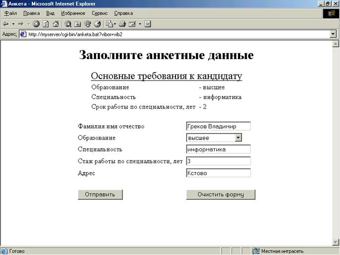 list.cgi use CGI qw(:standard); use DBI; print header(); print start_html("Список Вакансий для пользователя"); print qq{<body bgcolor="#faf1d8">}; print "<center><h1>Перечень вакансий</h1></center>"; print "<center>Выберите вакансию и заполните анкету</center>"; print "<br>"; $dbh=DBI->connect("dbi:mysql:konti"); $sth=$dbh->prepare("SELECT * FROM t1;"); $rows=$sth->execute(); print "<form action=\"http://myserver/cgi-bin/anketa.bat\">"; print "<center><table border=1>"; print qq{<tr ALIGN="center"><th> № </th> <th>Вакансия</th><th> Конкурс <br>на место</th> <th>Ваш<br>выбор</th></font></tr>}; for($i=0;$i<$rows;$i++) { ($bakans,$knkrs,$ed,$Cpc,$Crok)=$sth->fetchrow_array; $i++; print "<tr> <td ALIGN=\"center\">$i</td>"; $i--; print"<td>$bakans</td> <td><center>$knkrs</center></td> <TD><center><INPUT type=\"radio\" name=\"vibor\" value=\"vib$i\"></center></TD> </tr>"; } $sth->finish(); $dbh->disconnect(); print"</table></center>"; print "<br>"; print "<center><INPUT type=\"submit\" value=\"Заполнить анкету\"></center\>"; print "<br>"; print "<center>Анкеты претендентов будут рассмотрены 25 января 2003г.</center>"; print "</FORM>"; print end_html(); Файл anketa.cgi – исполняемая программа. Выводит перечень основных требований к кандидату на вакансию на основе данных таблицы t1 и предлагает претенденту заполнить анкетные данные о себе. Имеет 2 кнопки: - “Отправить" – запускает скрипт itog.cgi и передает в него анкетные данные претендента; - "Очистить форму" – стирает из формы ошибочно введенные анкетные данные.