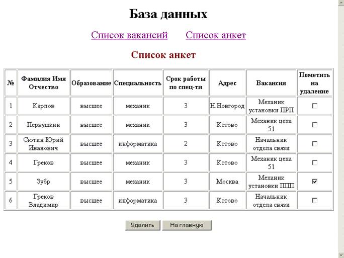 Контрольный пример работы администратора Просмотр списка вакансий (BDvakans.cgi).