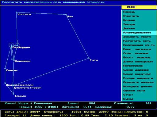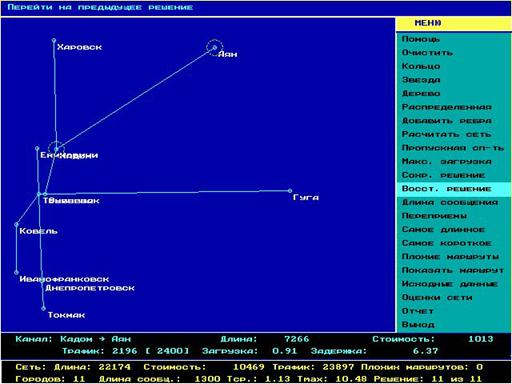 Виртуальные каналы сети пакетной коммутации, построенной на базе сети SDH и вторичной сети выделенных каналов. Эффективный способ соединения географически удаленных локальных вычислительных сетей. Frame Relay совместим со всеми протоколами, наиболее часто используемыми в ЛВС (TCP, Novell IPX, DECNET или NETBIOS). Этот протокол обеспечивает эффективную работу по каналам связи высокого качества. Позволяет эффективно передавать неравномерно распределенный по времени трафик. Обеспечивает малое время задержки при передаче информации через сеть. В отличие от вторичной сети выделенных каналов, для организации нового соединения нет необходимости устанавливать дополнительную аппаратуру. В стоимость услуги также входит установка модема для оптической или медной линии и маршрутизатора с портом 10-BaseT для подключения локальной сети клиента При централизованной маршрутизация в сети виртуальных каналов отправитель в адресат устанавливают виртуальный канал и маршрут между ними фиксируется на время сеанса связи. Решение об изменении маршрута между данной парой отправитель-адресат может приниматься только до начала сеанса связи. Непосредственной причиной перегрузок в сети связи является чрезмерная загруженность каналов связи. Поэтому заполняются буфера сетевых процессов (СП) в узлах, возникают блокировки. Было предложено использовать измеренную интенсивность потоков в каналах в качестве основного параметра системы управления потоками, которая объединяет функции маршрутизации пакетов и ограничения нагрузки в сети связи. В этом случае для каждого канала устанавливают пороговые значения интенсивности потоков и различают несколько состояний каналов, например: · нормальное, когда интенсивность потока в канале не превосходит 70% теоретически возможной; · предупреждающее - 70-80%; · тревожное - более 80%. Узлы сети обмениваются маршрутными таблицами, отражающими состояния каналов для каждого узла-адресата, что позволяет в каждом узле принимать решения по управлению потоками в зависимости от состояний канатов. Возможны различные варианты таких алгоритмов управления потоками. Например, когда в узле выходящий канал выбранного маршрута находится в предупреждающем состоянии, то пакет ставится в очередь к этому каналу, как при нормальных условиях, а отправителю посылается блокирующее сообщение, предписывающее ограничить поток. Если канал находится в тревожном состоянии, то пакет отбрасывается. 3. ЭКСПЕРИМЕНТАЛЬНАЯ ЧАСТЬ КУРСОВОГО ПРОЕКТА. РЕЗУЛЬТАТЫ ПРОЕКТИРОВАНИЯ РИВС. 3.1. АНАЛИЗ ТЕХНИЧЕСКОГО ЗАДАНИЯ Проектирование распределенной вычислительной сети для региональных вертикальных связей проводилось в 11 регионах. Каждый регион был оптимизирован в соответствии с заданием в программе NET-PRO. При детализации этапа проектирования вертикальной сети передачи данных использовались все вертикальные регионы, а при горизонтальной сети передачи данных осуществлялся анализ всех возможных топологий. Главными критериями при проектировании были выбор оптимальной проектируемой топологии и с критерием оптимизации по общей стоимости сети, при этом максимальное время задержки составляет не более 14сек., а среднее время задержки не превышает 1сек. Это достигалось увеличением числа переприемов между абонентскими пунктами. В результате выяснилось, что самы