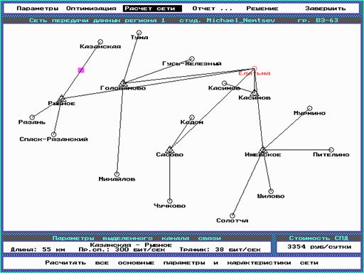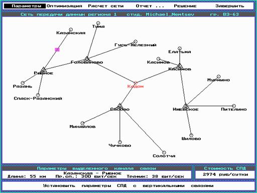3.2. ПРОЕКТИРОВАНИЕ РЕГИОНАЛЬНЫХ ВЕРТИКАЛЬНЫХ СЕТЕЙ Первоначально сеть передачи данных для региона 1 была представлена в том виде что она изображена на рис 1. Данный вариант сети небыл оптимизирован. Оптимизация проводилась по критерию обеспечивающему минимальную стоимость. В процессе оптимизации был изменен центр сети, изменены маршруты и их пропускные способности, также были изменены места расположения концентраторов и их пропускные способности – все эти изменения привели к тому что сеть стала наиболее оптимальной и ее стоимость снизилась на 11,33% по сравнению с первоначальной. На рис 2 изображена оптимизированная по критерию минимальной стоимости сеть передачи данных.Результаты синтеза сети передачи данных с вертикальными связями для региона 1 Полная стоимость СПД в сутки - 2974 рублей. Центр СПД - Кадом. Места размещения концентраторов: