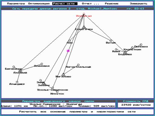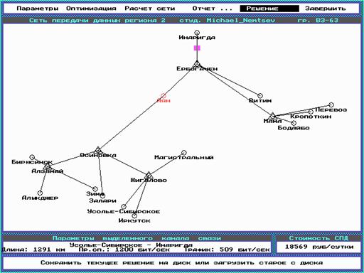 Первоначально сеть передачи данных для региона 2 была представлена в том виде что она изображена на рис 3. Данный вариант сети небыл оптимизирован. Оптимизация проводилась по критерию обеспечивающему минимальную стоимость. В процессе оптимизации был изменен центр сети, изменены маршруты и их пропускные способности, также были изменены места расположения концентраторов и их пропускные способности – все эти изменения привели к тому что сеть стала наиболее оптимальной и ее стоимость снизилась на 22,37% по сравнению с первоначальной. На рис 4 изображена оптимизированная по критерию минимальной стоимости сеть передачи данных.Результаты синтеза сети пеpедачи данных с веpтикальными связями для региона 2. Полная стоимость СПД в сутки - 18569 pублей. Центp СПД - Аян Meста pазмещения концентpатоpов