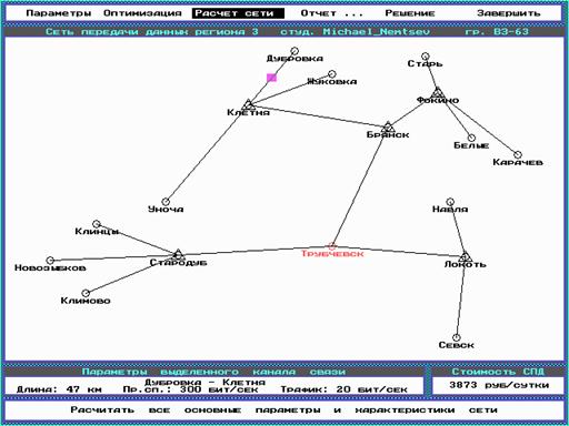 Первоначально сеть передачи данных для региона 3 была представлена в том виде что она изображена на рис 5. Данный вариант сети небыл оптимизирован. Оптимизация проводилась по критерию обеспечивающему минимальную стоимость. В процессе оптимизации был изменен центр сети, изменены маршруты и их пропускные способности, также были изменены места расположения концентраторов и их пропускные способности – все эти изменения привели к тому что сеть стала наиболее оптимальной и ее стоимость снизилась на 4,28% по сравнению с первоначальной. На рис 6 изображена оптимизированная по критерию минимальной стоимости сеть передачи данных.Результаты синтеза сети пеpедачи данных с веpтикальными связями для региона 3 Полная стоимость СПД в сутки - 3873 pублей. Центp СПД - Трубчевск Meста pазмещения концентpатоpов