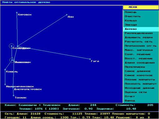 Для синтеза оптимальной древовидной сети используется алгоритм Прима, который порождает минимальное связанное дерево. Рассматривается определенное множество городов, которые необходимо объединить. Рис. 8.