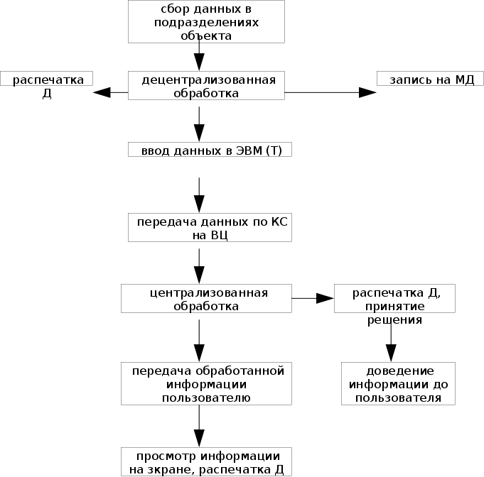 Недостатки Реляционной модели данных: низкая эффективность использования ресурсов вычислительной системы, но нет тех недостатков, которые имели место в иерархической и сетевой моделях. Группа БД ѕ распределенная. В случае централизованной БД при очень больших объемах данных для любой ее организации усугубляется проблема ее ведения и поддержания в актуальном состоянии. Кроме того, с ростом объема данных нелинейно, то есть очень быстро, возрастает время поиска и извлечения необходимых данных, время доступа к ним. Это приводит к необходимости разделения БД, ее рапсределении по местам сбора и обработки данных при сохранени возможности взаимного обмена между распределенными частями общей БД или локальными БД. Таким образом, распределнная БД представляет собой совокупонсть взаимосвязанных территориально разнесенных локальных БД, использующих одну общую систему управления распределенной БД (см схему 1). Каждая локальная БД представялет собой либо файловую систему, либо БнД со своей локальной СУБД, либо использующая и то и другое. Для пользователя организуется доступ к другим БД, который должен быть простым. Распределенная БД является составной частью распределенной системы обработки данных, которая включает также распределенные вычислительные ресурсы, то есть совокупность ЭВМ, распределенную систему управления этими ресурсами ѕ операционные системы, соединенные с главной ЭВМ, соединяющую их сеть передачи данных. 2.5. Организация внемашинной базы. Документооборот данного объекта представлен на схеме 2 (п.2.2. ѕ организация сбора и передачи информации), в п.2.2 описан сбор, передача, хранение информации. 2.6. Технологический процесс обработки данных