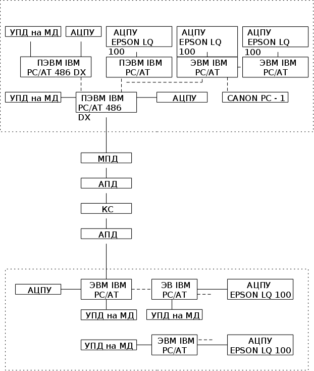 3. Разработка технического обеспечения системы 3.1 Структура КТС системы. В данном проекте будут рассмотрены три варианта систем обработки информации: I. Децентрализованный с передачей по КС II. Децентрализованный с передачей курьером III. ЛВС При проектировании ТО системы используем исходные данные, приведенные в п. 1.6 I. Децентрализованная система с передачей по КС. Предпологается связь абонента (т.е. подразделения) с ВЦ по КС, передача данных по КС. Эта система, однако, менее эффективна по сравнению с ЛВС, где предполагается также передача некоторых документов и машинных носителей курьером, что обеспечит снятие большой нагрузки с КС, а также передачу административных документов, требующих подпись Председателя Правления или других лиц. КС менее эффективен еще и потому, что существуют большие помехи, чем ЛВС (сеть ѕ более устойчива и помехозащищена). Структура КТС I представлена на схеме. II. Децентрализованная система с передачей курьером. Предполагается связь абонента с ВЦ посредством передачи пакетов курьером (на схеме 4 отсутствует структура АПД-КС-АПД-МПД. Она заменена курьером), что значительно задерживает время системы на запрос и ведет к неэффективному использованию рабочего времени. При объединении I и II системы исчезают недостатки II системы (увеичивается время ответа сситемы на запрос, эффективнее используется рабочее время). Однако остаются недостатки сиcтемы I, описанной выше. Для расчетов рассмотрим объединенный вариант системы I и II с целью получения результатов, более приближенных к действительности ( см схему 5). ВЦ