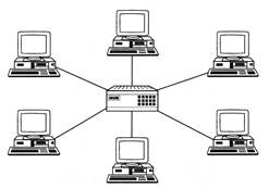 Топология "звезда" - схема соединения, при которой каждый компьютер подсоединяется к сети при помощи отдельного соединительного кабеля. Один конец кабеля соединяется с гнездом сетевого адаптера, другой подсоединяется к центральному устройству, называемому "концентратором". Схема соединения по топологии "звезда" приведена на рисунке 2.3
