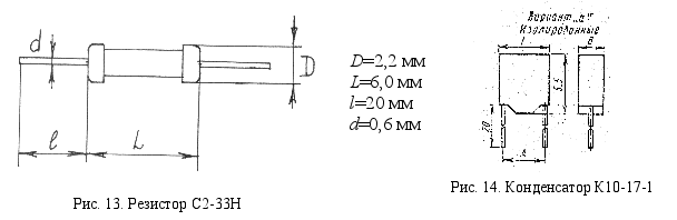 В принципе устройство может быть изготовлено с использованием микрополосковой технологии1, поскольку в диапазоне 0,25… 1 ГГц такая технология применяется достаточно широко, но в нашем случае получается реализовать изделие на сосредоточенных элементах, поскольку нам удалось выбрать сосредоточенные резисторы и конденсаторы для данного диапазона частот (пп. 4.1. и 4.2.). Внешний вид и геометрические размеры выбранных элементов показаны на рис. 13… 17.