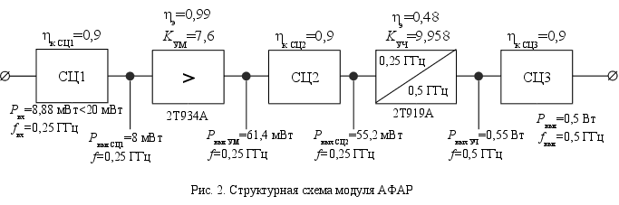 В Обычно при проектировании генераторной части модуля АФАР с умножением частоты бывают заданы Pвых, fвых, fвх, а также значение Pвх. В результате проектирования определяется число умножительных и усилительных каскадов в генераторной части модуля, типы активных приборов и электрических схем, используемые в каскадах, значения параметров режима активных приборов и элементов схем каскадов, а также вид конструктивного выполнения каскадов. 2. расчет Структурной схемы модуля АФАРСтруктурная схема модуля АФАР представлена на рис. 2. Имея заданную выходную мощность Pвых, зададимся контурными КПД согласующих цепей (СЦ1, СЦ2, СЦ3) (ηк СЦ1 = ηк СЦ2 = ηк СЦ3 = ηк СЦ = 0,9) и найдем мощность на выходе умножителя частоты: