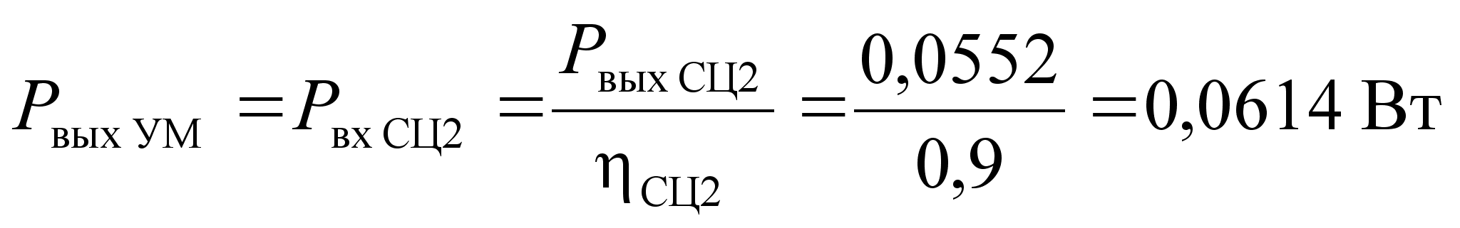 Поскольку, как упоминалось выше, мы задали контурный КПД согласующих цепей равным ηк СЦ = 0,9, то мощность на входе СЦ2 Pвх СЦ2, равная мощности на выходе усилителя мощности Pвых УМ, равна: