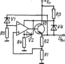 При построении высоковольтных стабилизаторов (Uвых > З0 В) целесообразно использовать схемы высоковольтных усилителей. На рис. 7.6 показана схема высоковольтного стабилизатора, где ОУ «взвешен» относительно входа эмиттерного повторителя, построенного на транзисторе V3. Характерной особенностью схемы является наличие как ООС, так и ПОС в усилителе. В момент включения питания цепь ООС выключена (стабилитрон VI заперт), вследствие чего выходное напряжение нарастает релаксационно до уровня, при котором происходит пробой стабилитрона VI. Уровень выходного стабилизированного напряжения определяется из условия равенства напряжений на резисторах R1 и R5, т. е.