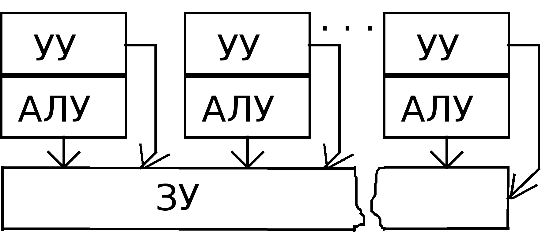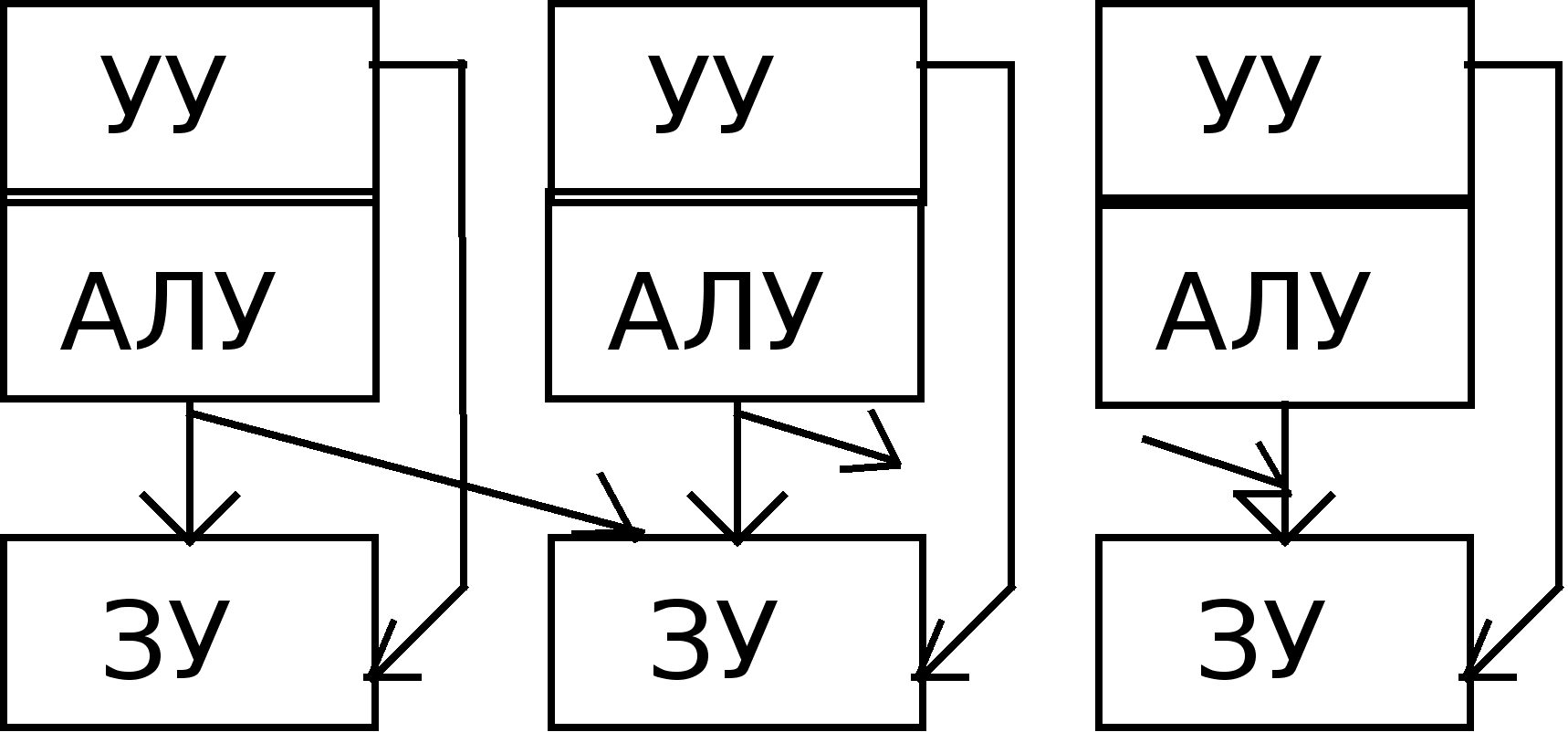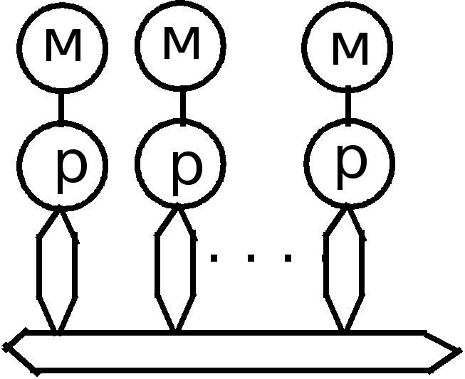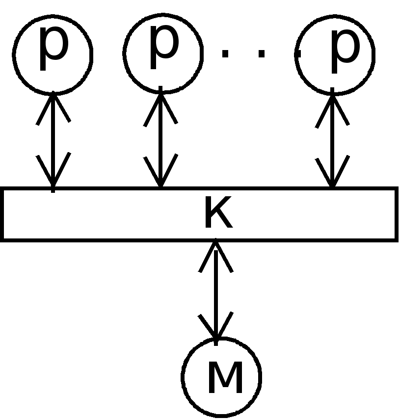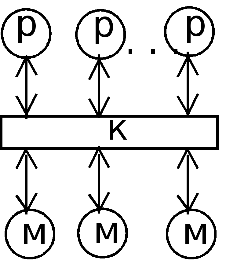 Идеальной машиной является вычислительная система, у которой каждый процессор имеет прямые каналы связи с другими процессорами, но в этом случае требуется чрезвычайно большой объем оборудования для организации межпроцессорных обменов. Определенный компромисс представляет сеть с фиксированной топологией, в которой каждый процессор соединен с некоторым подмножеством процессоров системы. Если процессорам, не имеющим непосредственного канала обмена, необходимо взаимодействовать, они передают сообщения через промежуточные процессоры. Одно из преимуществ такого подхода - не ограничивается рост числа процессоров в системе. Недостаток - требуется оптимизация прикладных программ, чтобы обеспечить выполнение параллельных процессов, для которых необходимо активное воздействие на соседние процессоры. Наиболее интересным вариантом для перспективных параллельных вычислительных комплексов является сочетание достоинства архитектур с распределенной памятью и каналами межпроцессорного обмена. Один из возможных методов построения таких комбинированных архитектур - конфигурация с коммутацией, когда процессор имеет локальную память, а соединяются процессоры между собой с помощью коммутатора (машина 9). Коммутатор может оказаться весьма полезным для группы процессоров с распределяемой памятью (машина 8). Данная конфигурация похожа на машину с общей памятью (машина 7), но здесь исключены проблемы пропускной способности шины. Недостатками классификации Т.Джона является скрытие уровня параллелизма в системе. Параллелизм любого рода требует одновременной работы, по крайней мере, двух устройств. Такими устройствами могут быть: арифметико-логические устройства (АЛУ), устройства управления (УУ). В ЭВМ классической архитектуры УУ и АЛУ образуют процессор. Увеличение числа процессоров или числа АЛУ в каждом из них приводит к соответствующему росту параллелизма. Наличие в ЭВМ нескольких процессоров означает, что одновременно (параллельно) могут выполняться несколько программ или несколько фрагментов одной программы. Работа нескольких АЛУ под управлением одного УУ означает, что множество данных может обрабатываться параллельно по одной программе. В соответствии с этим описание структур параллельных систем можно представить в виде упорядоченной тройки: , где k - количество устройств управления, т.е. наибольшее количество независимо и одновременно выполняемых программ в системе; d - количество АЛУ, приходящихся на одно устройство управления; w - количество разрядов, содержимое которых обрабатывается одновременно (параллельно) одним арифметико-логическим устройством. Другая форма распараллеливания - конвейеризация, также требует наличия нескольких ЦП или АЛУ. В то время, как множество данных обрабатывается на одном устройстве, другое множество данных может обрабатываться на следующем устройстве и т.д., при этом в процессе обработки возникает поток данных от одного устройства (ЦП или АЛУ) к следующему. В течение всего процесса над одним множеством данных выполняется одно за другим n действий. Одновременно в конвейере на разных стадиях обработки могут находиться от 1 до n данных. Параллелизм и конвейеризацию можно рассматривать на трех различных уровнях, представленных в таблице 2. Шесть основных форм параллелизма, в широком с