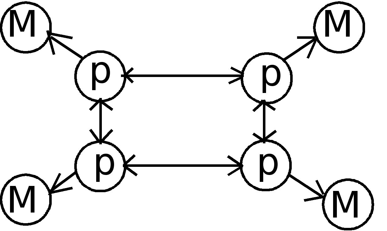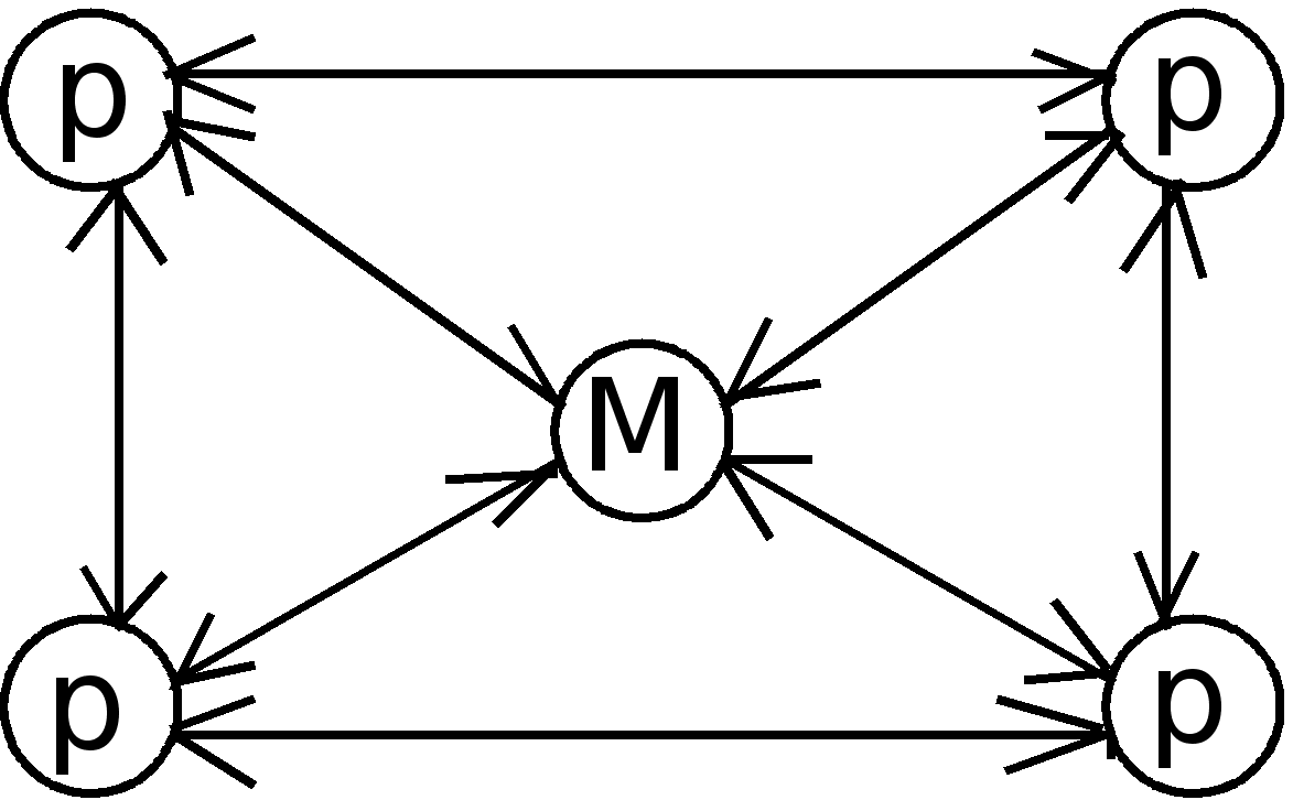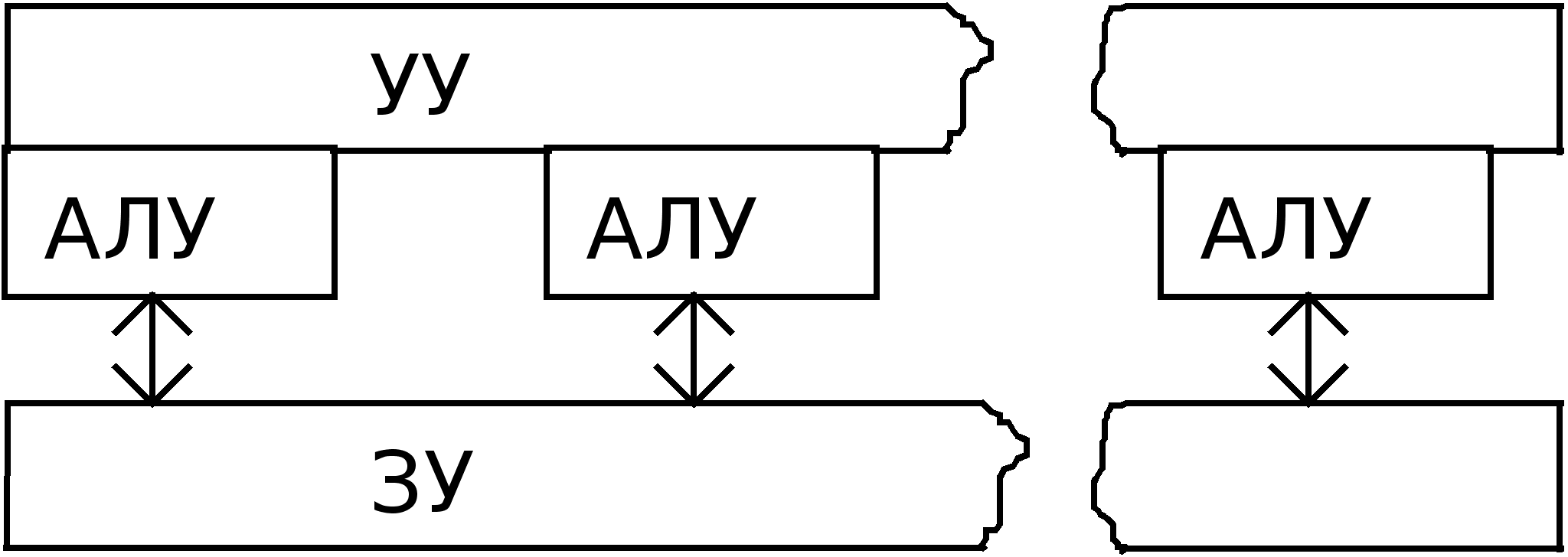 Идеальной машиной является вычислительная система, у которой каждый процессор имеет прямые каналы связи с другими процессорами, но в этом случае требуется чрезвычайно большой объем оборудования для организации межпроцессорных обменов. Определенный компромисс представляет сеть с фиксированной топологией, в которой каждый процессор соединен с некоторым подмножеством процессоров системы. Если процессорам, не имеющим непосредственного канала обмена, необходимо взаимодействовать, они передают сообщения через промежуточные процессоры. Одно из преимуществ такого подхода - не ограничивается рост числа процессоров в системе. Недостаток - требуется оптимизация прикладных программ, чтобы обеспечить выполнение параллельных процессов, для которых необходимо активное воздействие на соседние процессоры. Наиболее интересным вариантом для перспективных параллельных вычислительных комплексов является сочетание достоинства архитектур с распределенной памятью и каналами межпроцессорного обмена. Один из возможных методов построения таких комбинированных архитектур - конфигурация с коммутацией, когда процессор имеет локальную память, а соединяются процессоры между собой с помощью коммутатора (машина 9). Коммутатор может оказаться весьма полезным для группы процессоров с распределяемой памятью (машина 8). Данная конфигурация похожа на машину с общей памятью (машина 7), но здесь исключены проблемы пропускной способности шины. Недостатками классификации Т.Джона является скрытие уровня параллелизма в системе. Параллелизм любого рода требует одновременной работы, по крайней мере, двух устройств. Такими устройствами могут быть: арифметико-логические устройства (АЛУ), устройства управления (УУ). В ЭВМ классической архитектуры УУ и АЛУ образуют процессор. Увеличение числа процессоров или числа АЛУ в каждом из них приводит к соответствующему росту параллелизма. Наличие в ЭВМ нескольких процессоров означает, что одновременно (параллельно) могут выполняться несколько программ или несколько фрагментов одной программы. Работа нескольких АЛУ под управлением одного УУ означает, что множество данных может обрабатываться параллельно по одной программе. В соответствии с этим описание структур параллельных систем можно представить в виде упорядоченной тройки: , где k - количество устройств управления, т.е. наибольшее количество независимо и одновременно выполняемых программ в системе; d - количество АЛУ, приходящихся на одно устройство управления; w - количество разрядов, содержимое которых обрабатывается одновременно (параллельно) одним арифметико-логическим устройством. Другая форма распараллеливания - конвейеризация, также требует наличия нескольких ЦП или АЛУ. В то время, как множество данных обрабатывается на одном устройстве, другое множество данных может обрабатываться на следующем устройстве и т.д., при этом в процессе обработки возникает поток данных от одного устройства (ЦП или АЛУ) к следующему. В течение всего процесса над одним множеством данных выполняется одно за другим n действий. Одновременно в конвейере на разных стадиях обработки могут находиться от 1 до n данных. Параллелизм и конвейеризацию можно рассматривать на трех различных уровнях, представленных в таблице 2. Шесть основных форм параллелизма, в широком с