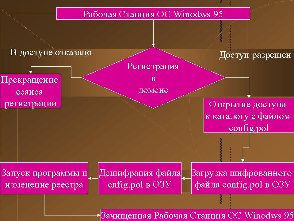Как видно для внесения любого изменения в реестр необходимо произвести три действия, поскольку мы не можем контролировать состояние реестра. Поскольку командный фал является интерпретируемым, то данные действия, выполняющиеся и без того медленно, могут привести систему к зависанию на несколько минут. К недостатку который делает невозможным использование этой системы можно отнести, то что данный программный продукт не имеет никакой поддержки многопользовательского режима. Эти существенные недостатки показываю нам, что мы не можем использовать данную программу в учебных или промышленных целях. Это продиктовано тем условием, что пользователи ответственные за разработку защиты ОС Windows 95 за частую мало квалифицированны и обучение пользования командной строкой может занять очень много времени, а по истечению некоторого времени, ели оператор долго не работал с этим программным продуктом, навык быстро теряется. 2.3 Описание алгоритма При регистрации пользователя в контролере домена система ОС Windows 95 производит поиск файла конфигурации config.pol в каталоге определенным администратором домена как общедоступный для всех пользователей домена. При нахождение фала модификации реестра происходит его загрузка в оперативную память машины - клиента. В памяти происходит дешифрация шифрованного файла и затем система интерпретирует расшифрованный файл и производит модификацию реестра. Всё вышесказанное можно пояснить следующей иллюстрацией: