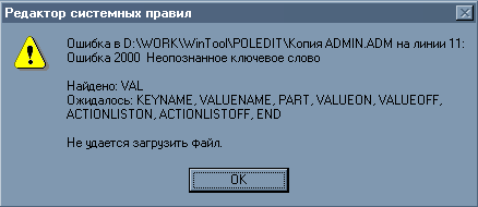 С Пользователь должен нажать на кнопку "ОК" и заново ввести путь к сохраненному файлу config.pol. Если сообщение повториться, то это означает что файл config.pol поврежден и необходимо восстановить его из резервной копии.