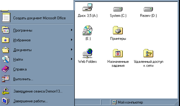 Пример 2: Проверка правильности реакции ОС Windows 95 на внесённые изменения (удаление папки «Настройка» из меню пуск и папки «Мой Компьютер») Ожидаемый результат: после сохранения файла config.pol на сервер и повторной регистрации клиента ОС Windows 95 в контролере домена папка «Настройка» из меню пуск и папки «Мой Компьютер» должна исчезнуть, тем самым лишив пользователя доступа к настройкам ОСWinodws 95. Полученный результат: